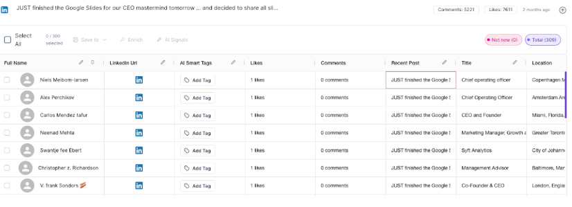 You can use Trigify’s engagement insights to pinpoint profiles that engage with your posts the most to target or retarget them in your campaigns.