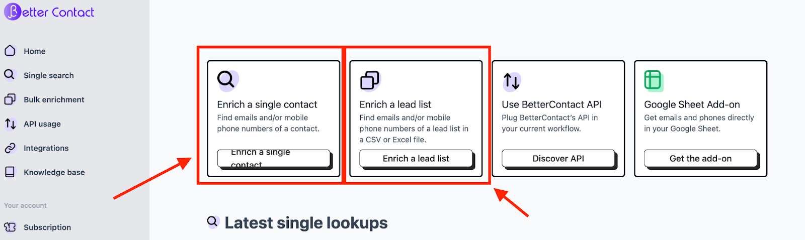 Once you log in to BetterContact, you’ll have options to look up a single email or find emails in bulk: