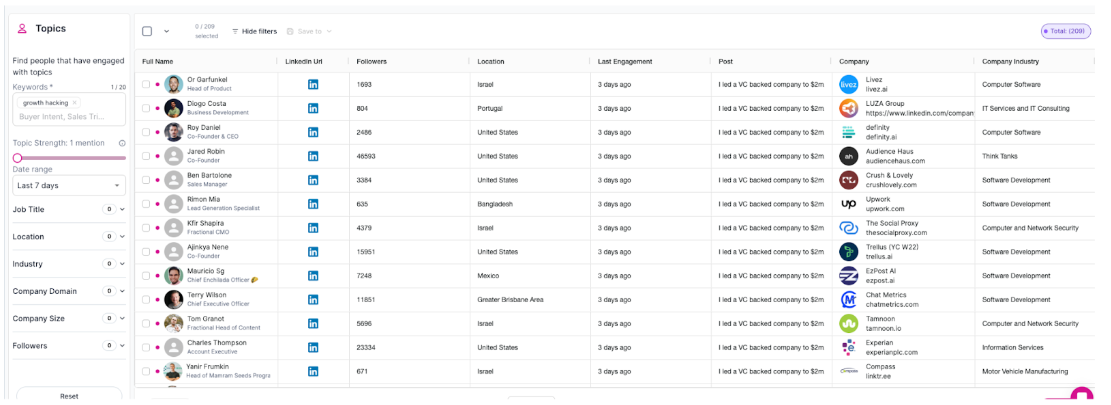 Build real-time lead lists based on LinkedIn activity - Instead of scraping data from a database that’s already outdated, you can build prospect lists based on current activity. For example: "Show me marketing managers in SaaS companies who liked posts about lead generation in the last 7 days."